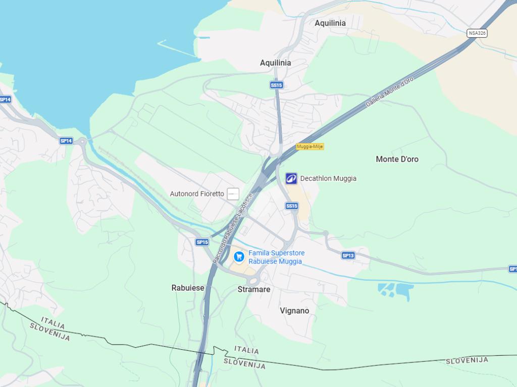 Il complesso commerciale si trova in posizione strategica a 4 km dal confine con la Slovenia e a 1,3 km dall’ autostrada Sistiana-Rabuiese. Da Trieste dista 13 km.