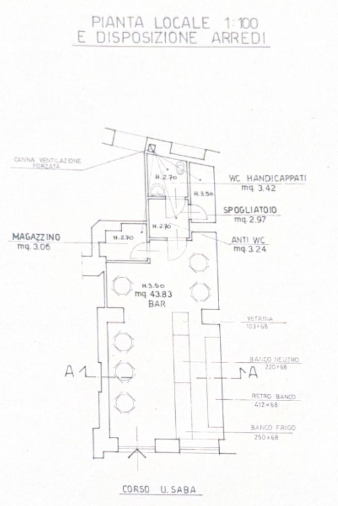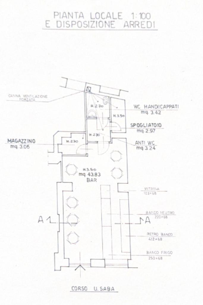 La sala principale è composta da un'area di somministrazione con 6 tavolini, una zona banco completa di tutto il necessario ed esposta sia verso l'interno del locale che su Corso Saba.
