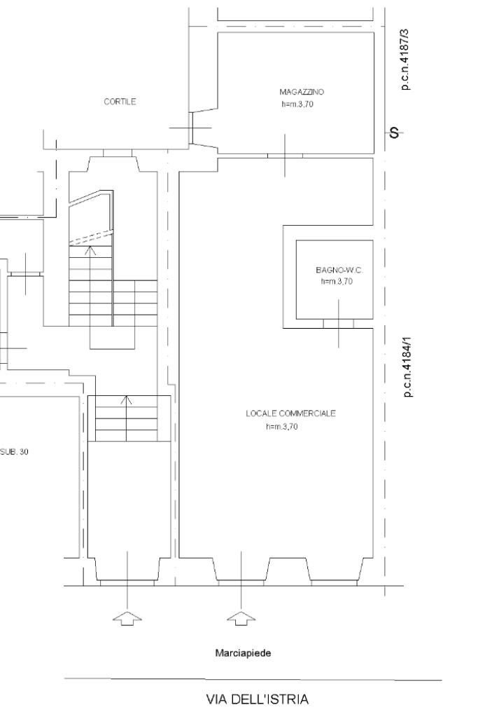 Locale commerciale composto da un ampio vano principale affacciato su Via dell'Istria, seguito poi da un servizio igienico, un disimpegno, un vano magazzino ed un'ulteriore ambiente utilizzabile come ufficio, laboratorio o zona deposito.