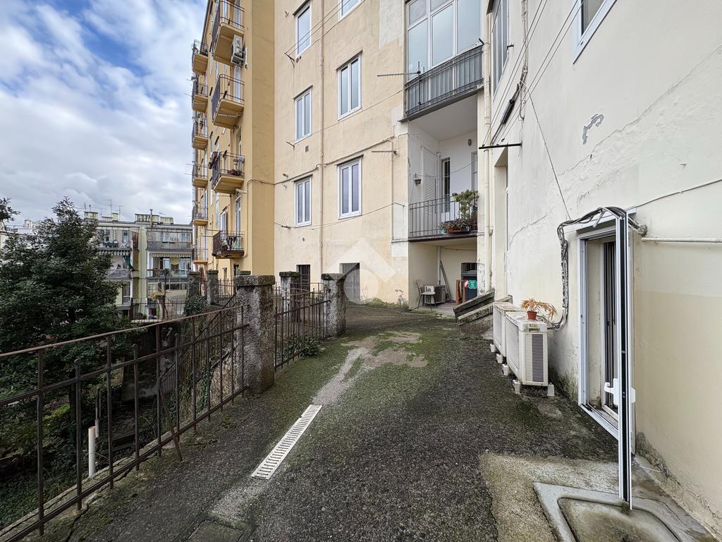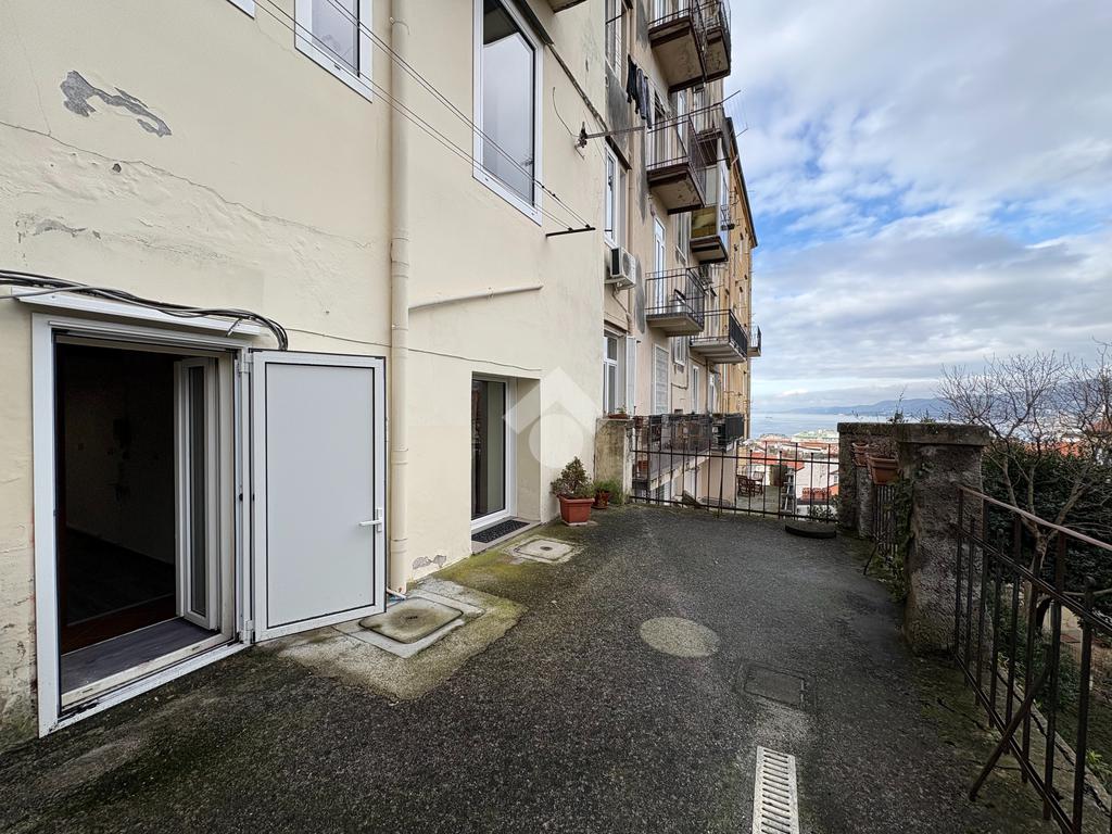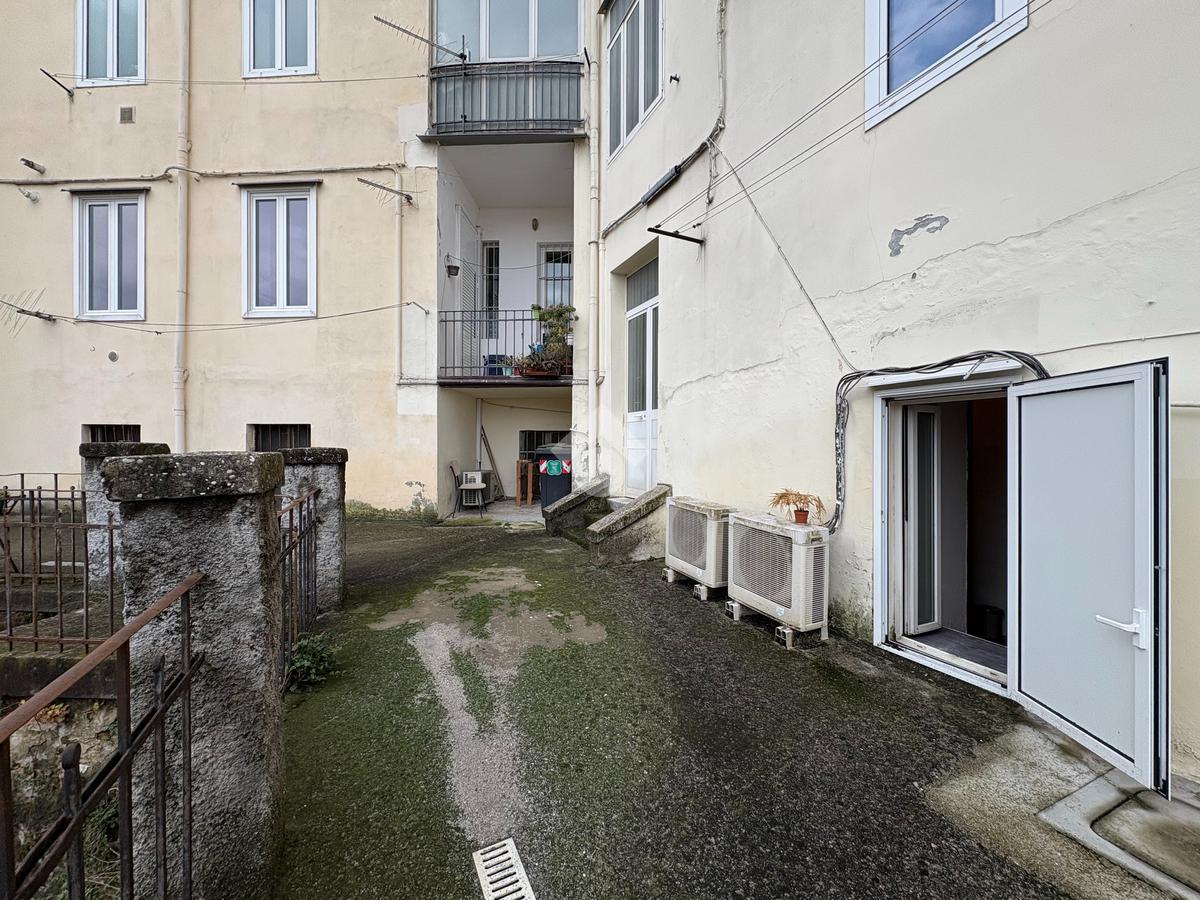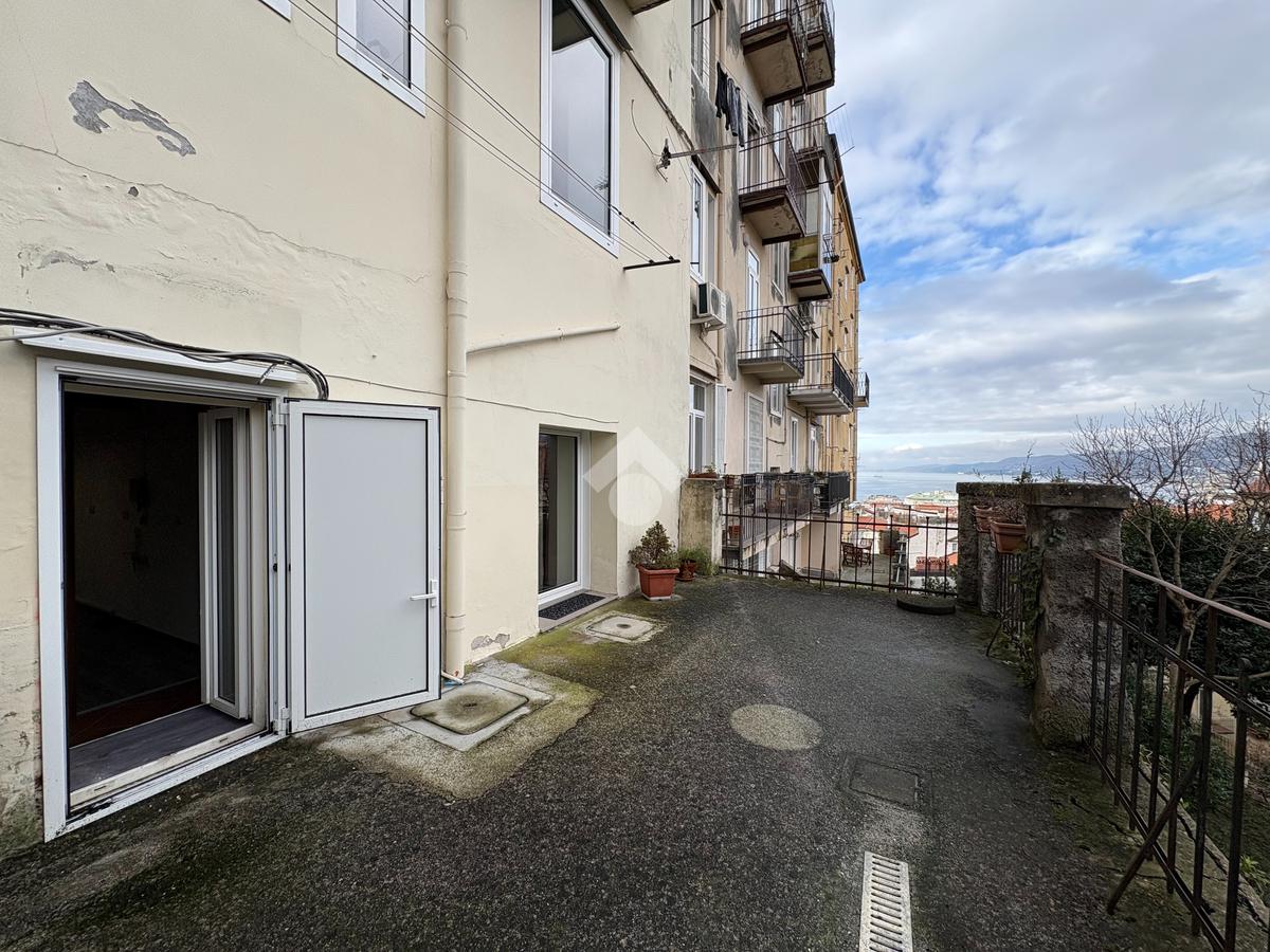 Dall' interno del foro commerciale, tramite una porta finestra, è possibile accedere ad una piccola corte condominiale con scorcio mare.