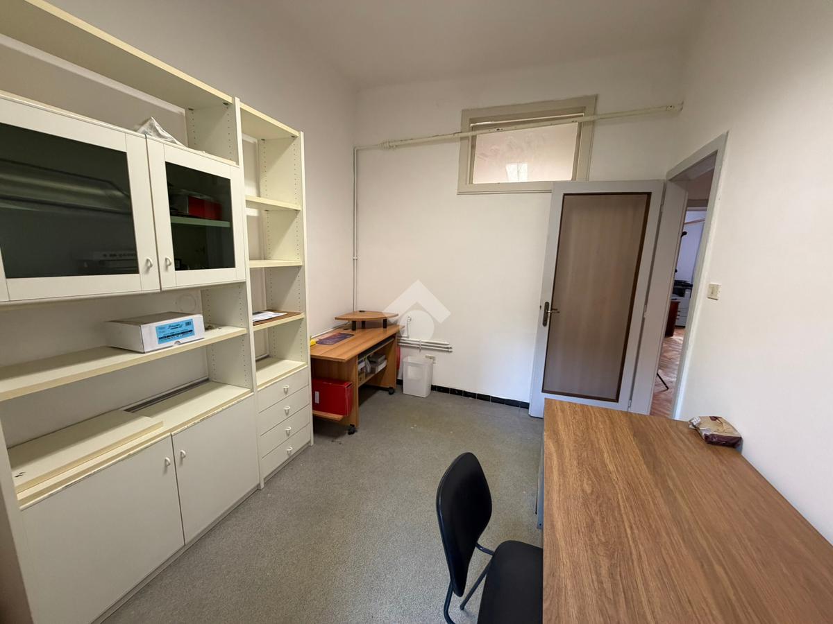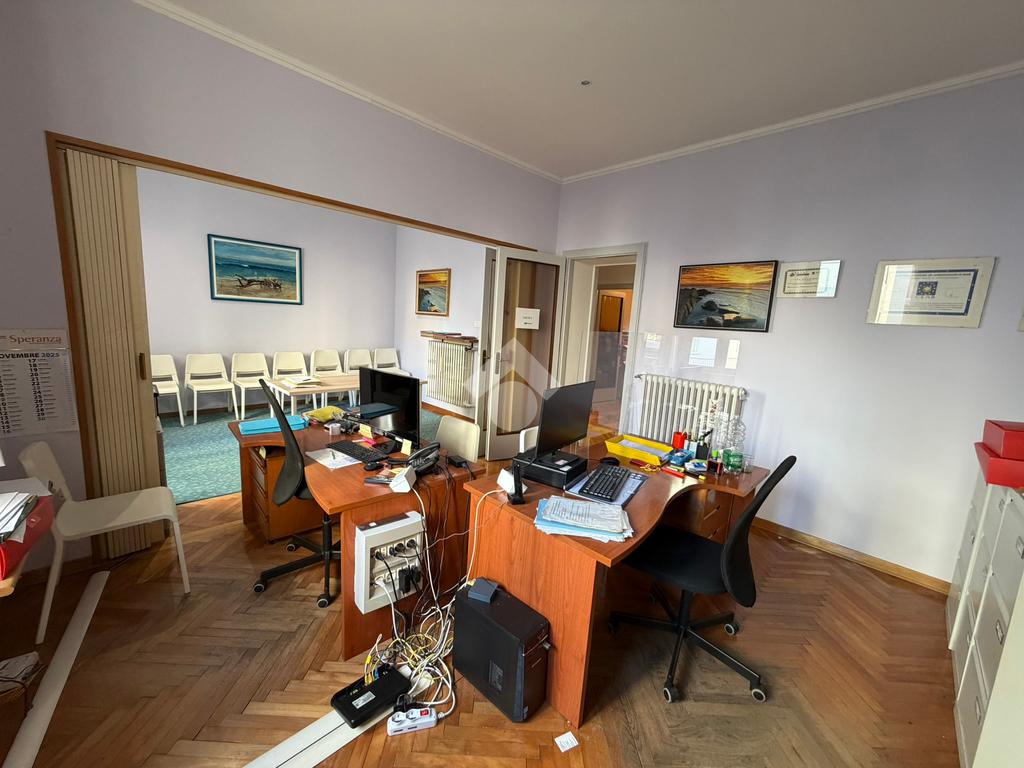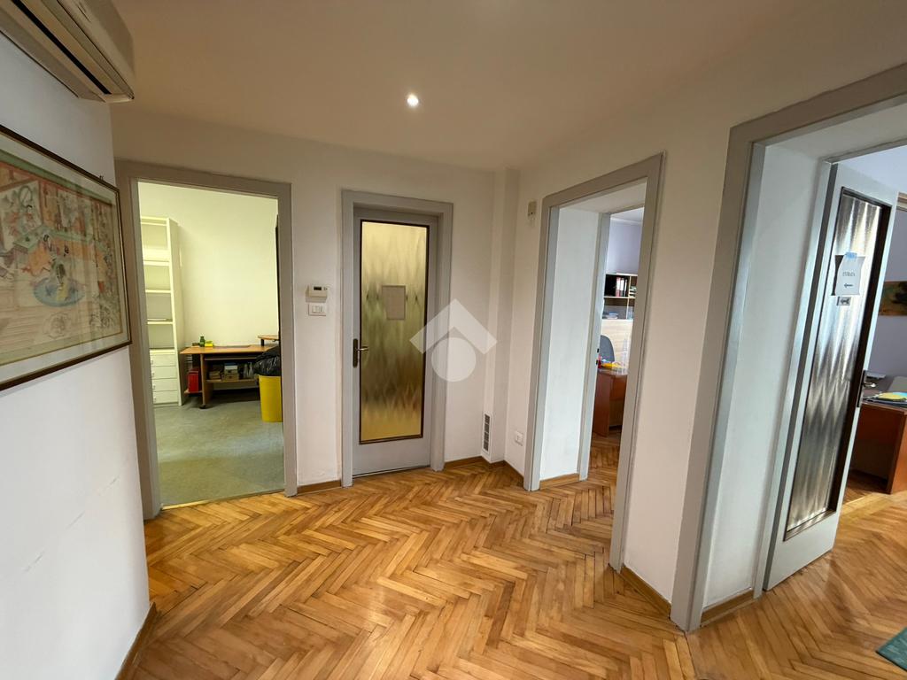 L'immobile è composto da atrio d'ingresso, quattro stanze ad uso ufficio, un bagno e wc separati, balcone ed una cantina.
